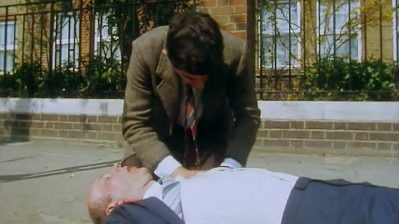 At the bus stop, Mr Bean tries his best to revive a heart attack victim.